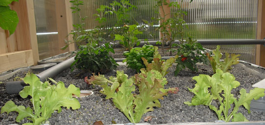 Dazu wurde südseitig ein angelehntes Gewächshaus angebaut, das für die Aufzucht der Pflanzen und Fische benötigt wird. Das Gewächshaus wurde in Holzbauweise errichtet. Stegdreifachplatten dienen für den entsprechenden Licht- und Wärmeeitrag.